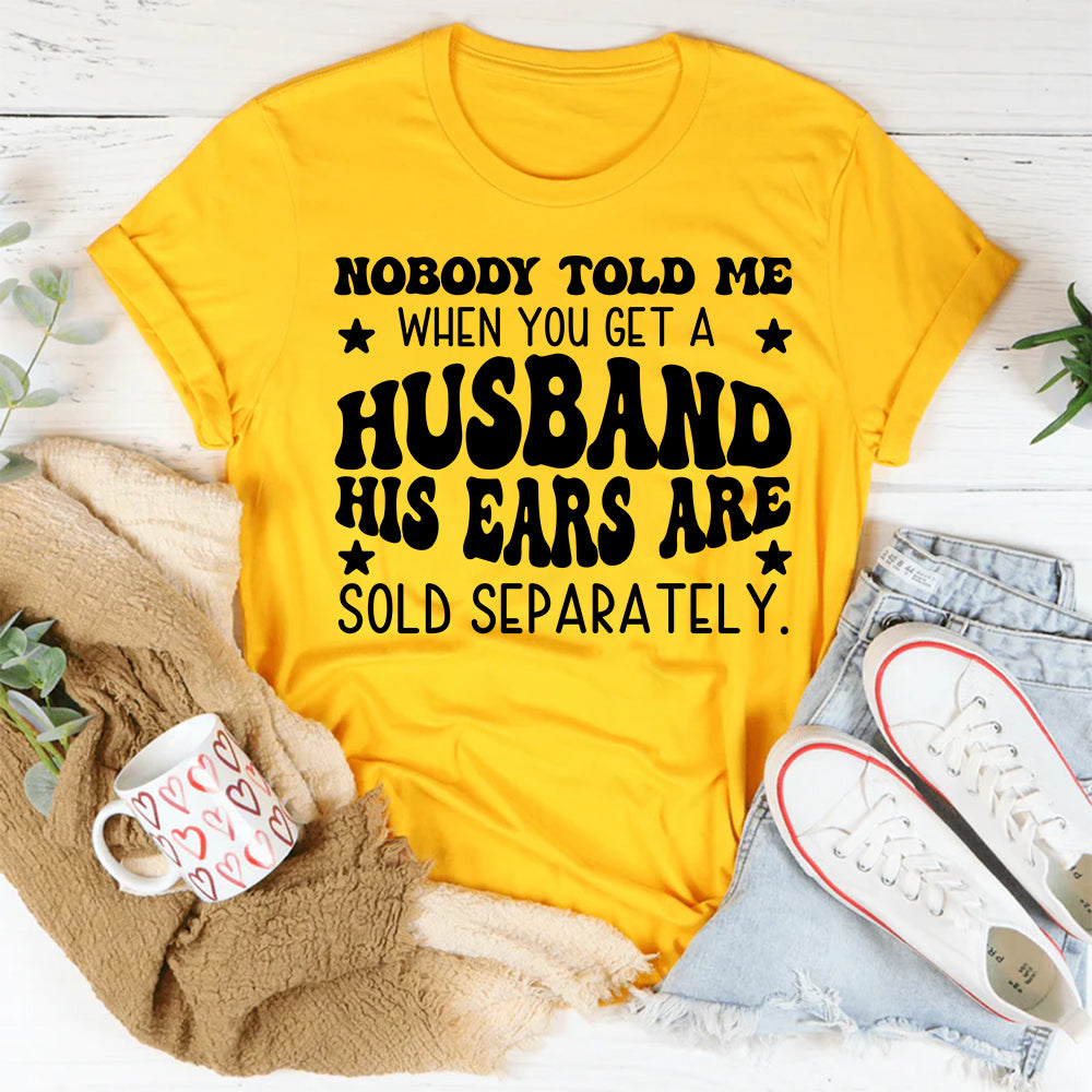 Funny, sarcastic, and painfully accurate. The “Nobody Told Me When You Get a Husband His Ears Are Sold Separately” t-shirt is a lighthearted jab at married life and selective hearing. It’s playful humor every wife can relate to—because asking twice is basically a love language.