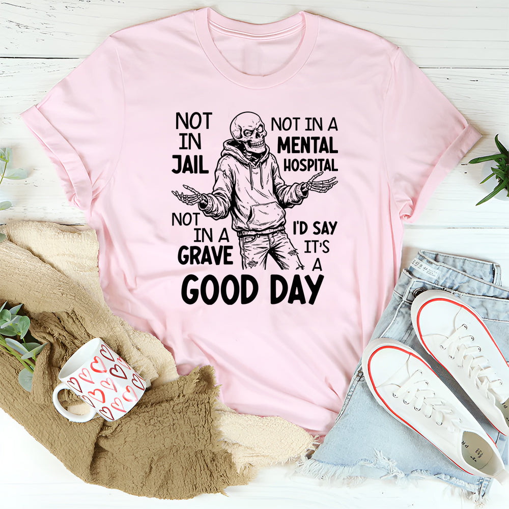 Darkly humorous, sarcastic, and unapologetically honest. The “Not in Jail, Not in a Mental Hospital, Not in a… I’d Say It’s a Good Day” t-shirt is the perfect blend of dry humor and real-life perspective. It’s for anyone who measures success by simply surviving the chaos of everyday life—with a smirk.