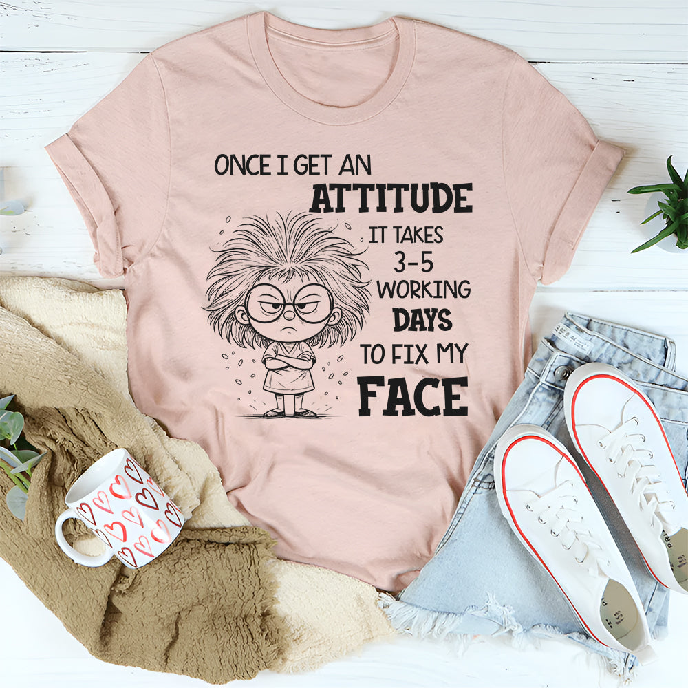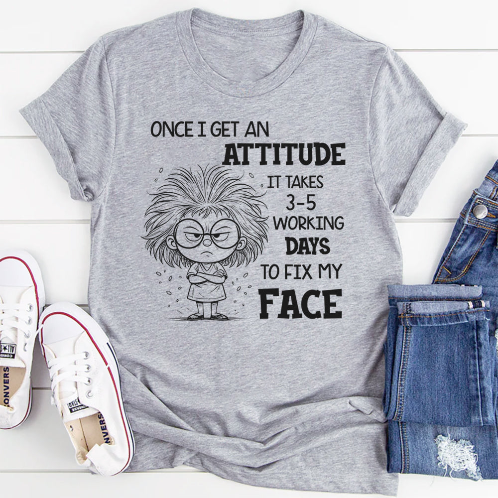 Bring some attitude to your wardrobe with the “Once I Get an Attitude It Takes 3–5 Business Days to Fix My Face” t-shirt. Perfect for anyone who knows their mood shows loud and clear, this funny design is a must-have for people with unapologetic sass.