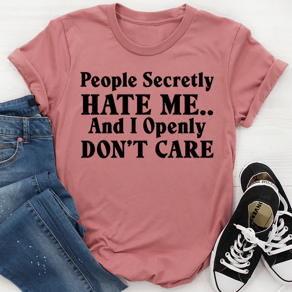 Bold, unapologetic, and hilariously honest. The “People Secretly Hate Me… And I Openly Don’t Care” T-shirt is for anyone who thrives on confidence, sarcasm, and zero tolerance for drama. It’s a fearless statement for those who march to their own beat—no approval required.