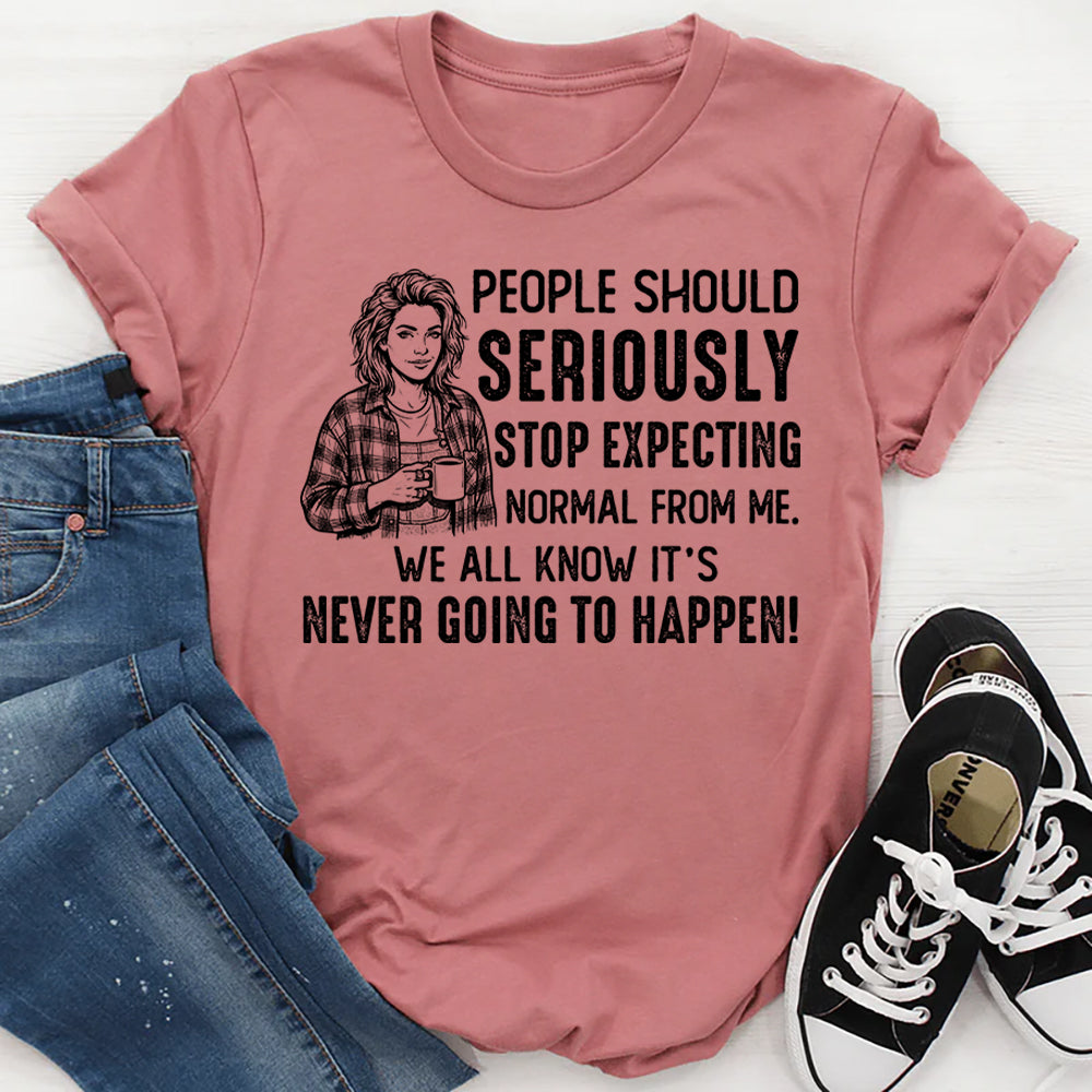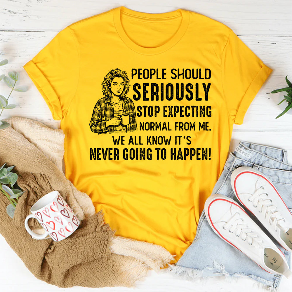 Funny, bold, and unapologetically real, the “People Should Seriously Stop Expecting Normal from Me… We All Know It’s Never Going to Happen!” T-shirt is perfect for anyone who embraces their quirks and refuses to fit into anyone’s box. It’s a playful declaration of individuality, chaos, and self-acceptance.