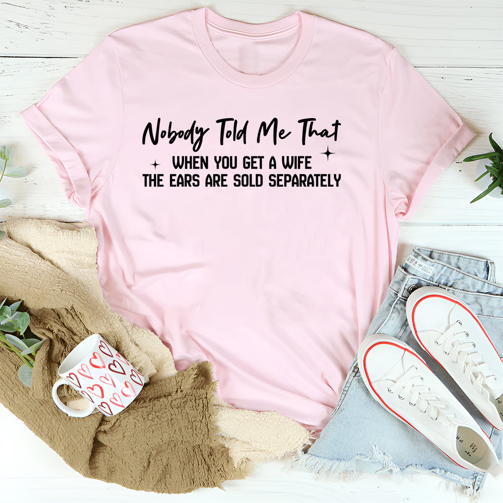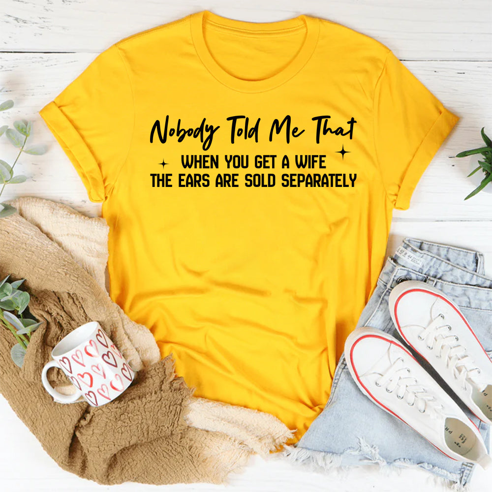 Hilarious, cheeky, and perfectly relatable. The “Nobody Told Me That… When You Get a Wife, the Ears Are Sold Separately” T-shirt is for anyone who knows marriage comes with surprises — especially when it comes to listening skills. Because sometimes love means learning the hard way.
