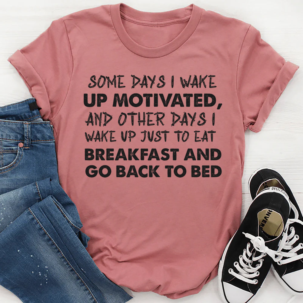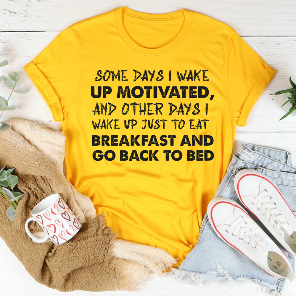 Add some humor to your wardrobe with the “Some Days I Wake Up Motivated and Other Days I Wake Up Just to Eat Breakfast and Go Back to Bed” t-shirt. Perfect for anyone who knows the struggle of balancing ambition with the undeniable love of sleep, this funny tee is as real as it gets.