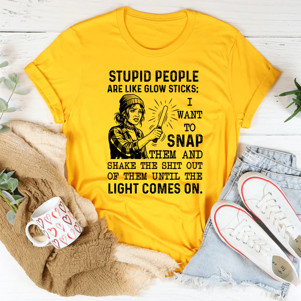 Sarcastic, edgy, and unapologetically blunt. The “Stupid People Are Like Glow Sticks; I Want to Snap Them and Shake the Sh*t Out of Them Until the Light Comes On” t-shirt delivers dark humor with a heavy dose of exaggeration. It’s a metaphor-packed joke for anyone who’s ever tested the limits of patience—and prefers laughing about it instead.