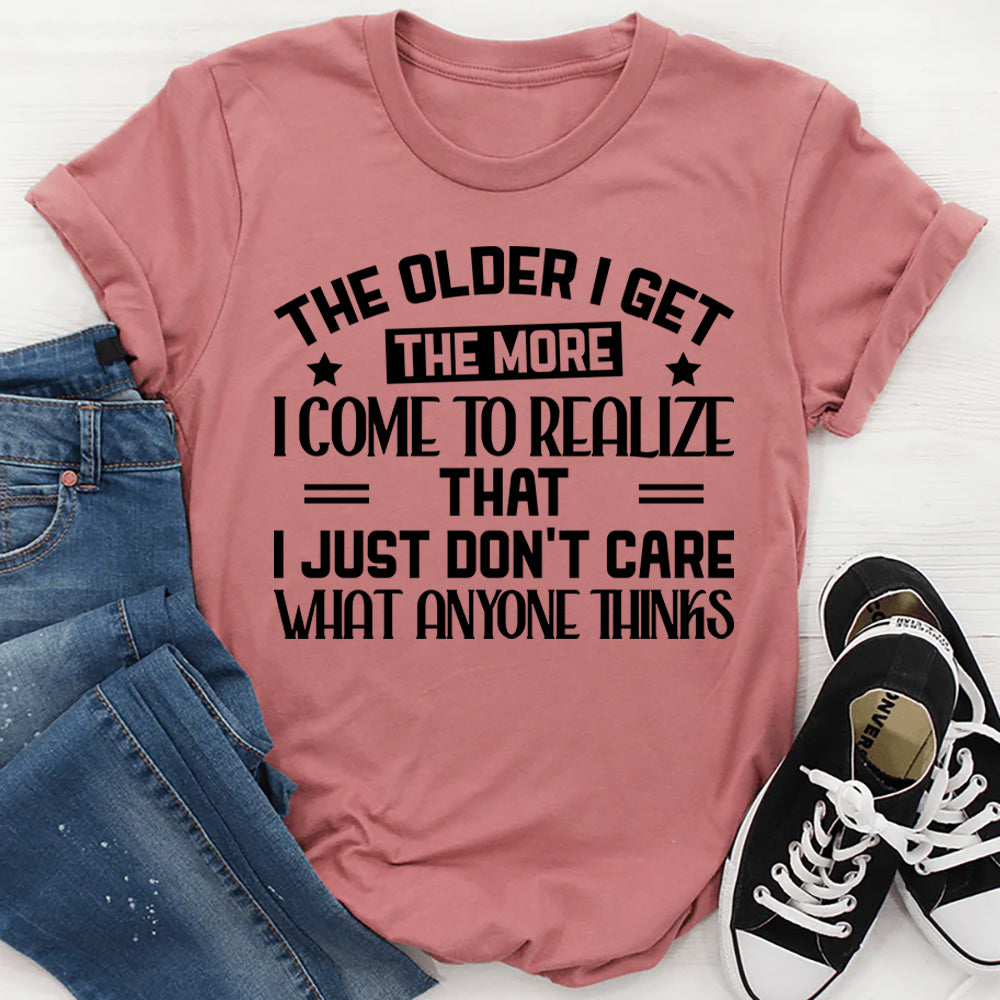 Free‑spirited, honest, and unapologetically authentic. The “The Older I Get, The More I Come to Realize That I Just Don’t Care What Anyone Thinks” T-shirt celebrates self-confidence, independence, and the joy of living life on your own terms. It’s a playful nod to the wisdom that comes with age—and the freedom to embrace it fully.
