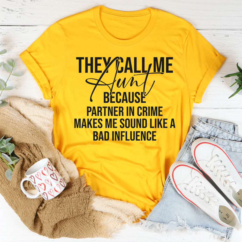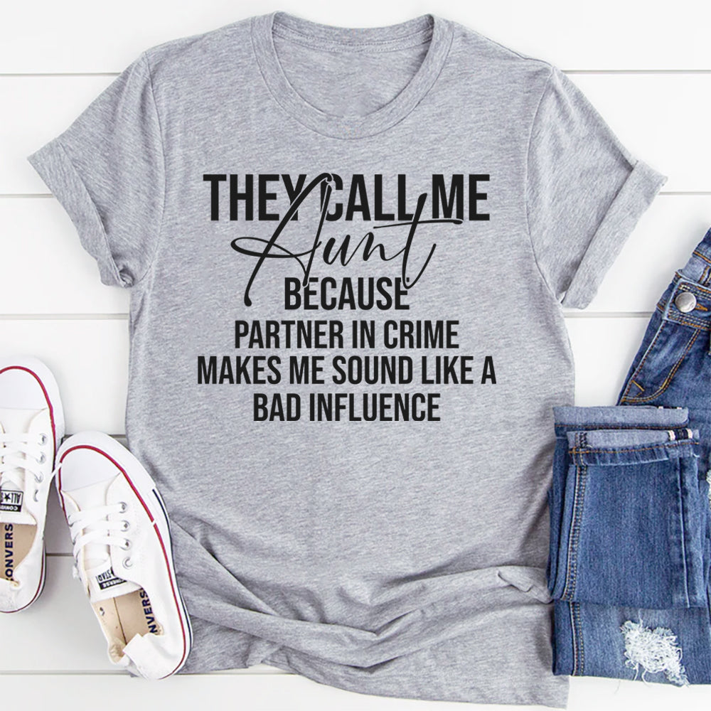 Celebrate your favorite title with the “They Call Me Aunt Because Partner in Crime Makes Me Sound Like a Bad Influence” t-shirt. Perfect for the cool, fun-loving aunt who’s always up for adventures (and maybe a little mischief), this tee captures the joy of being everyone’s favorite sidekick.