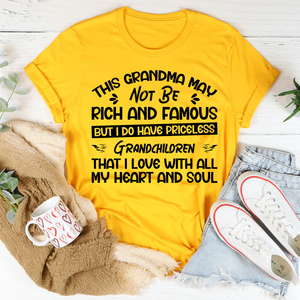 Heartfelt, proud, and full of love. The “This Grandma May Not Be Rich and Famous, But I Do Have Priceless Grandchildren That I Love With All My Heart and Soul” t-shirt is a warm tribute to the joy, pride, and unconditional love that only grandparents know. It’s perfect for grandmas who wear their hearts on their sleeves—literally.