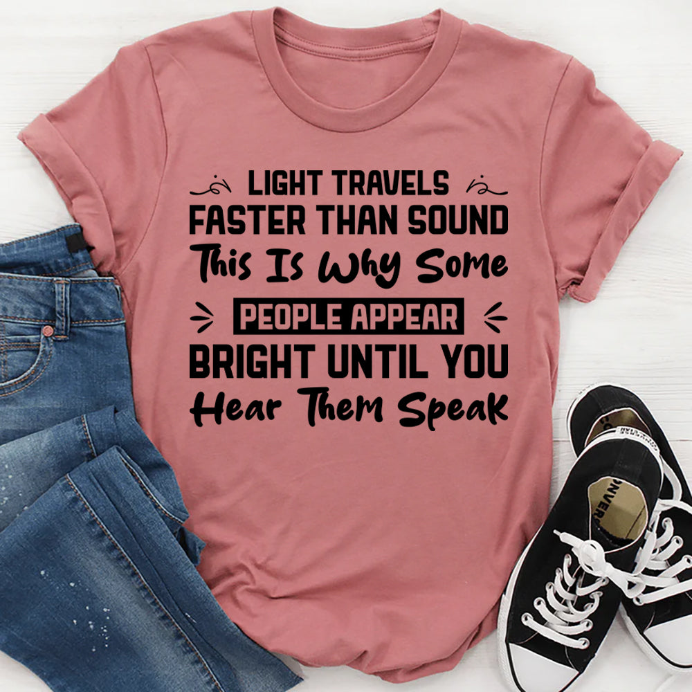 Witty, sarcastic, and delightfully clever. The “Travels Light, Faster Than Sound — This Is Why Some People Appear Bright Until You Hear Them Speak” t-shirt is perfect for anyone who loves sharp humor and a little playful shade. It’s a tongue-in-cheek nod to those moments when first impressions don’t quite match reality.