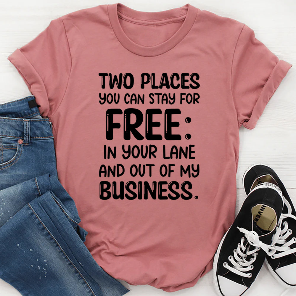 Witty, bold, and unapologetically direct. The “Two Places You Can Stay for Free: In Your Lane and Out of My Business” t-shirt is a sharp, sarcastic reminder that boundaries are non-negotiable. It’s humor with an edge, perfect for anyone who values their space and speaks their mind.