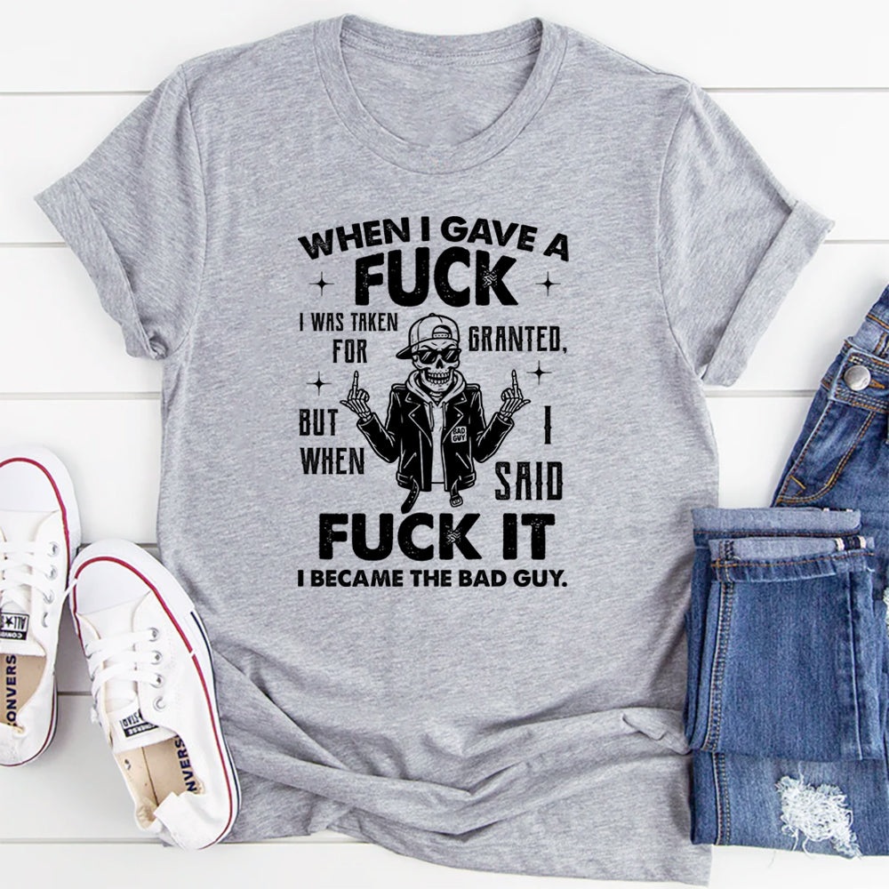 Witty, unapologetic, and fiercely honest. The “When I Gave a Fuck I Was Taken for Granted. So I Said Fuck It. I Became the Bad Guy” t‑shirt is a bold declaration of self-respect and boundary-setting. Perfect for anyone who’s done being walked over and isn’t afraid to own their power with a dash of attitude.