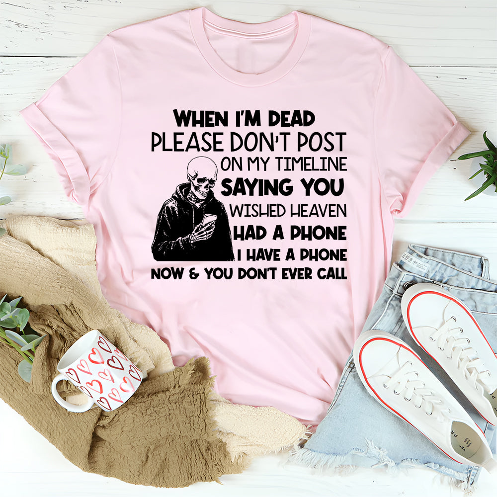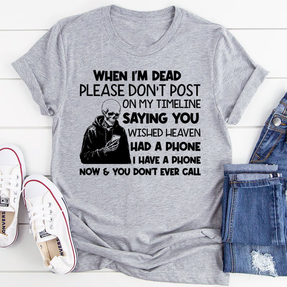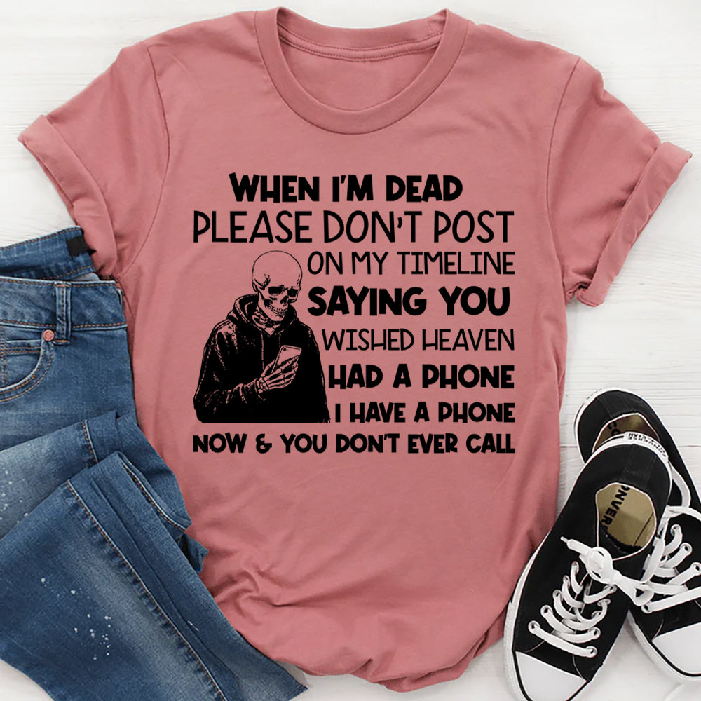 Darkly funny, brutally honest, and unapologetically real. The “When I’m Dead, Please Don’t Post on My Timeline Saying You Wish Heaven Had a Phone — I Have a Phone Now & You Don’t Ever Call” T-shirt is perfect for anyone who values real connections over fake sympathy. Sharp, sarcastic, and emotionally honest, this tee turns truth into a statement that hits hard.