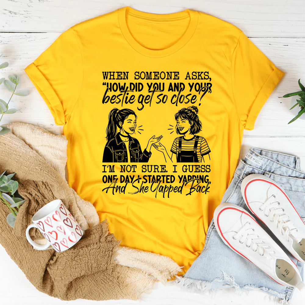 Funny, heartfelt, and perfectly relatable. The “When Someone Asks, ‘How Did You and Your Bestie Get So Close?’ — I’m Not Sure… I Guess One Day I Started Yapping, and She Yapped Back” T-shirt celebrates the effortless magic of true friendship. It’s a playful reminder that the best bonds don’t need explanations—they just happen.