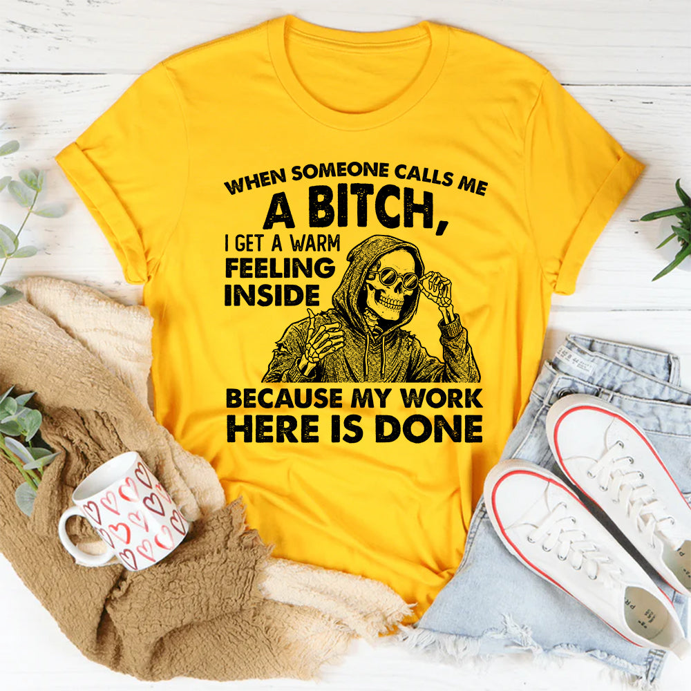 Funny, bold, and unapologetically confident. The “When Someone Calls Me a Bitch, I Get a Warm Feeling Inside Because My Work Here Is Done” t‑shirt is made for anyone who knows that sometimes doing your job well means ruffling a few feathers. It’s a playful nod to self-assurance, wit, and owning your attitude.