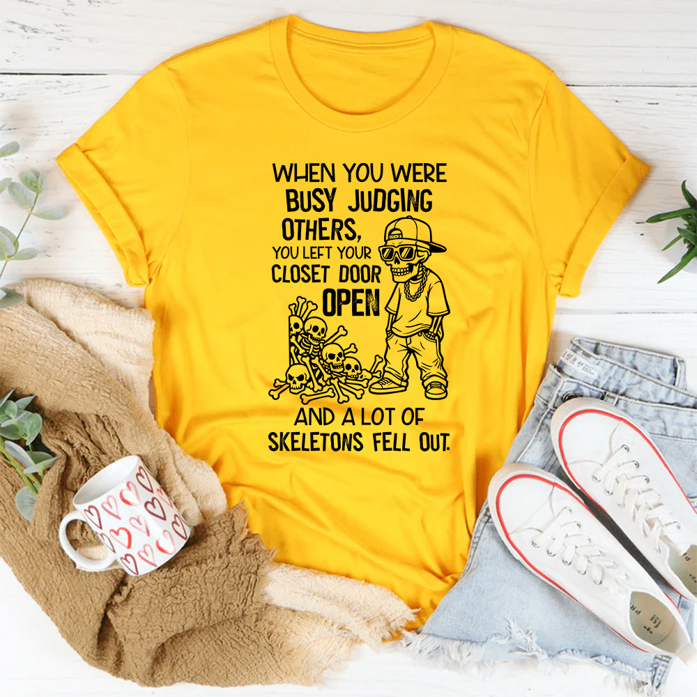 Witty, sharp, and unapologetically honest. The “When You Were Busy Judging Others, You Left Your Closet Door Open and a Lot of Skeletons Fell Out” t-shirt delivers a playful but cutting dose of truth. Perfect for anyone who loves a little sarcastic humor while calling out hypocrisy.