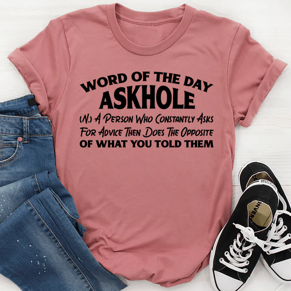 Funny, clever, and perfectly savage. The “Word of the Day: Askhole (N.) – A Person Who Constantly Asks for Advice Then Does the Opposite of What You Told Them” T‑shirt is for anyone who’s tired of giving guidance that goes ignored… and loves calling it out with humor.