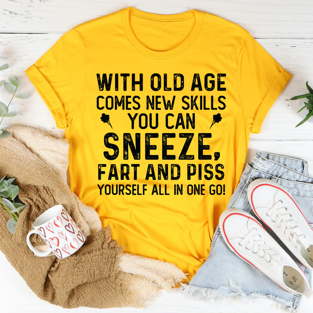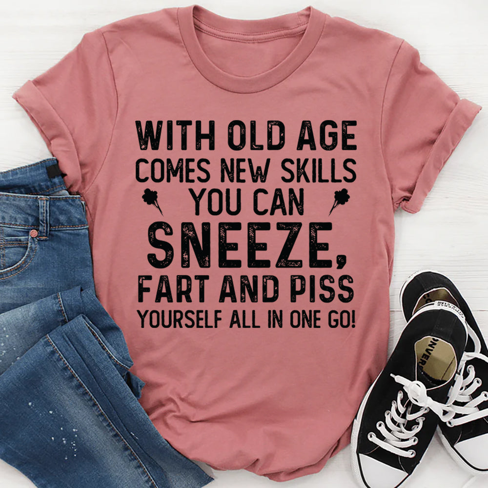 Crude, hilarious, and brutally honest. The “With Old Age Comes New Skills…” t-shirt is made for those who embrace getting older with zero shame and a wicked sense of humor. It’s bold, unapologetic, and guaranteed to get laughs from anyone who appreciates real-life comedy.