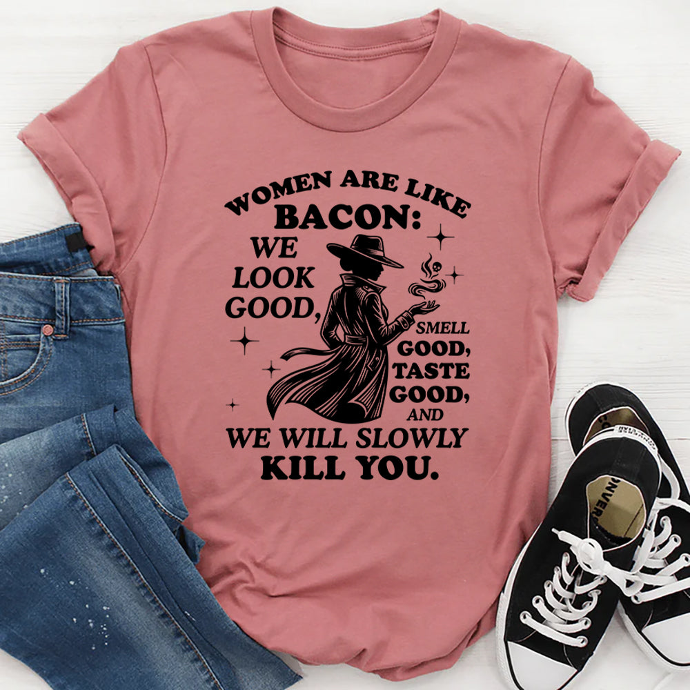 Bold, cheeky, and unapologetically savage. The “Women Are Like Bacon” t-shirt serves up humor with attitude, blending confidence, sass, and a little danger into one unforgettable statement. It’s playful, provocative, and guaranteed to turn heads—because some comparisons are just too accurate to ignore.