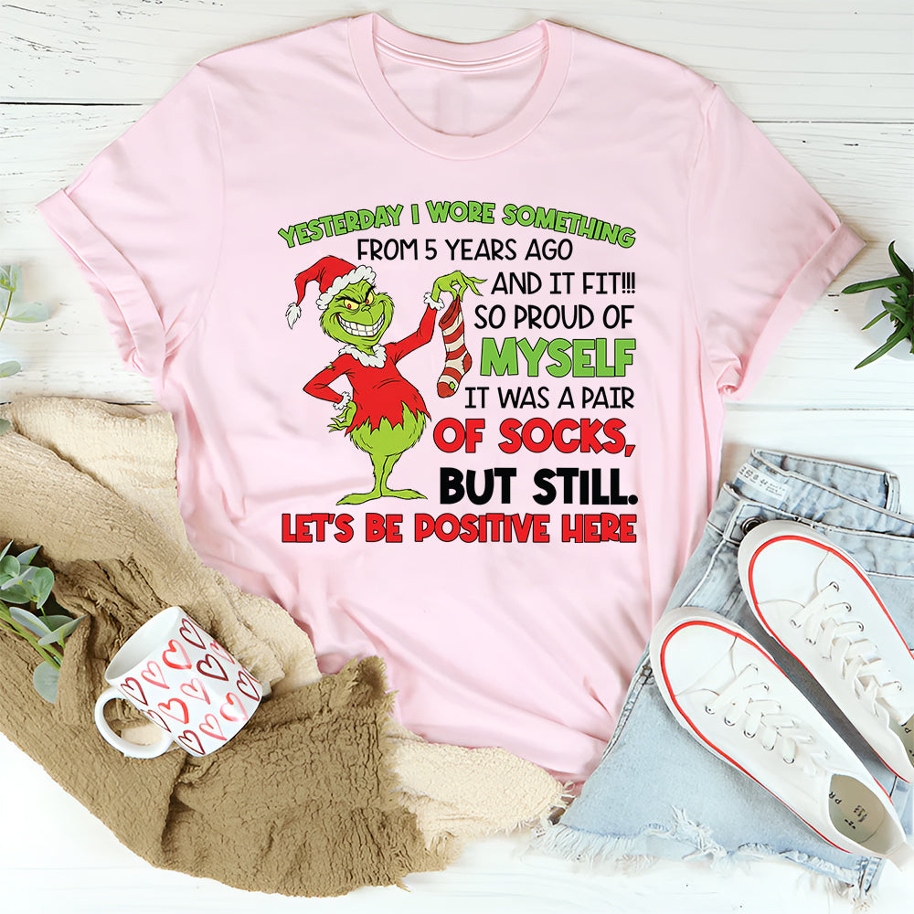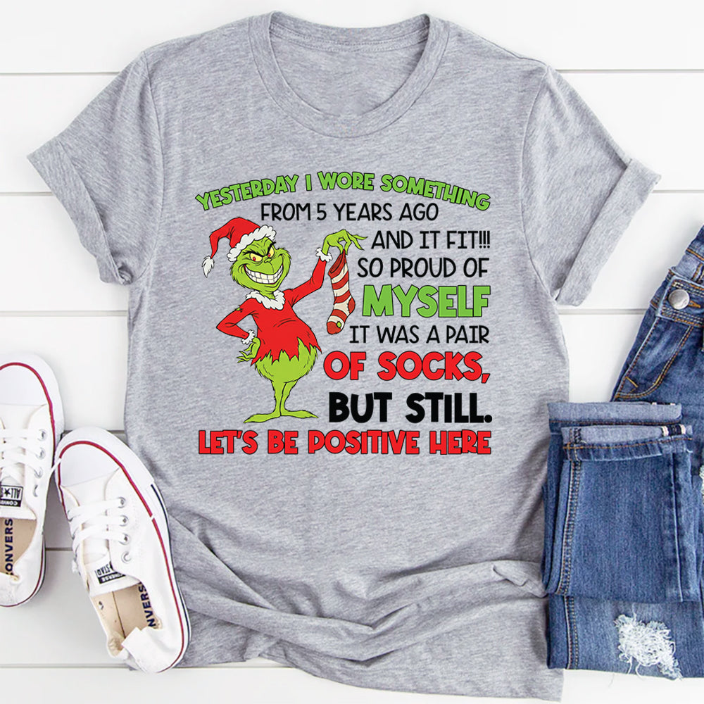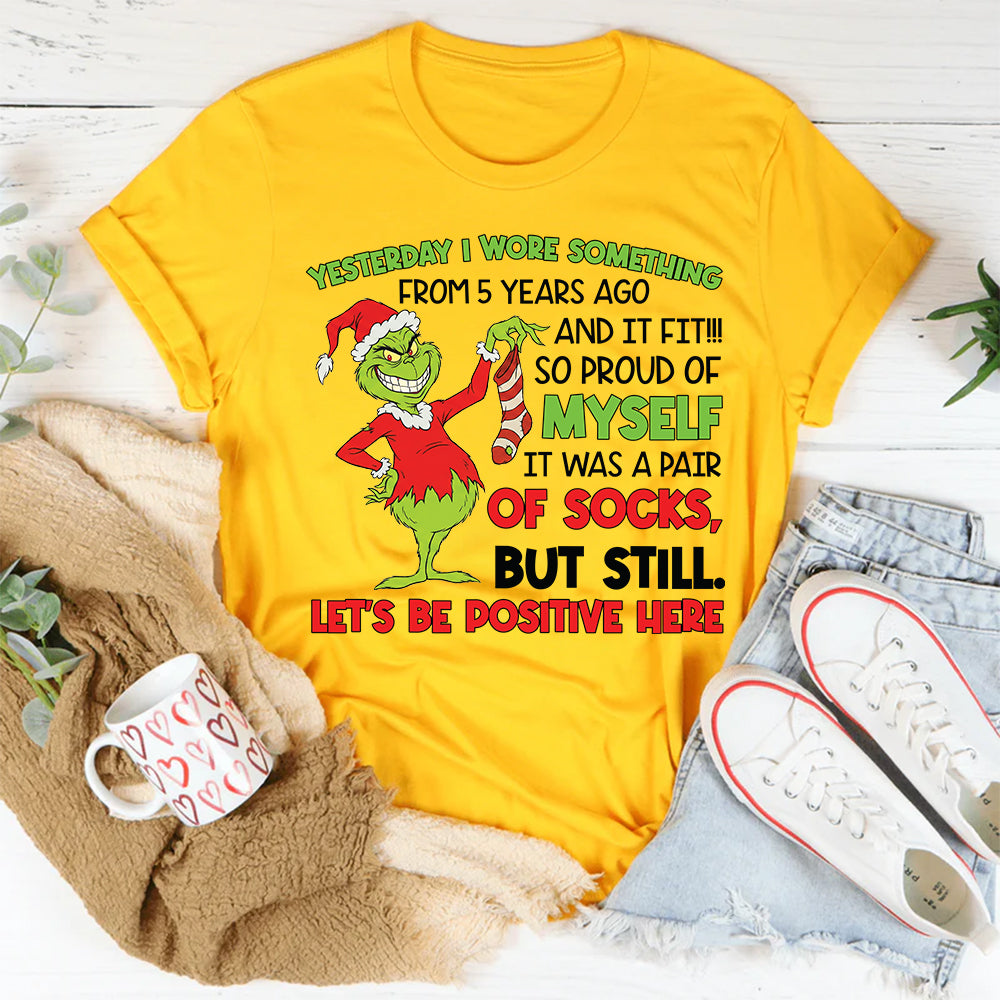 Funny, quirky, and delightfully self-aware. The “Yesterday I Wore Something From 5 Years Ago and It Fit. So Proud of Myself. It Was a Pair of Socks, But Still. Let’s Be Positive Here” t‑shirt is made for anyone who celebrates the small victories in life—even if it’s just socks. It’s a playful nod to humor, optimism, and the little things that make you smile.