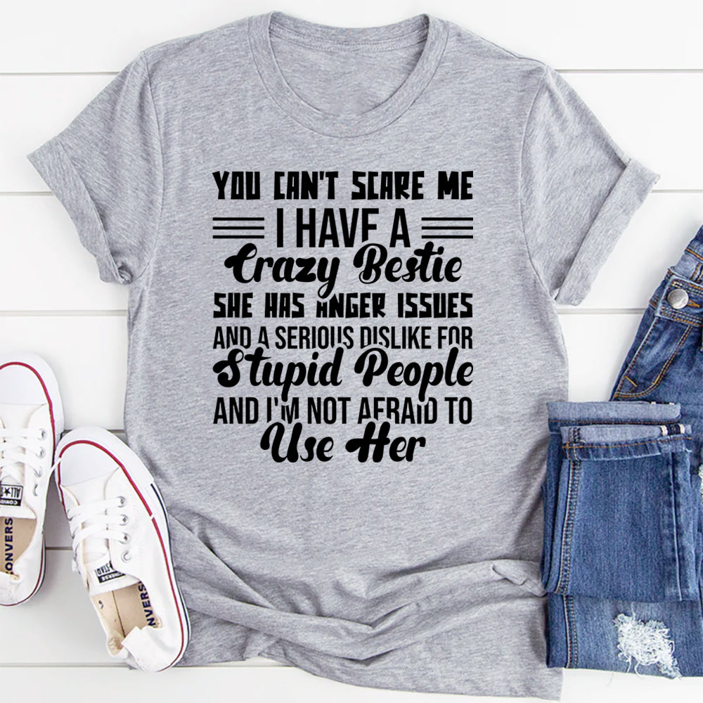 Funny, bold, and unapologetically sassy. The “You Can’t Scare Me—I Have a Crazy Bestie. She Has Anger Issues and a Serious Dislike for Stupid People, and I’m Not Afraid to Use Her” t‑shirt delivers humor with an edge. Perfect for anyone with a fearless friendship and a love for playful intimidation.