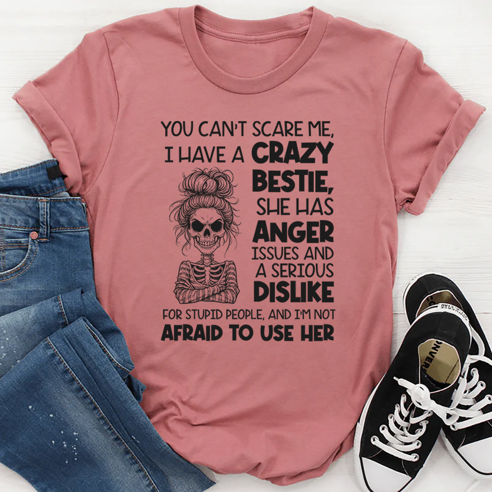 You can’t scare someone who’s got backup! This “You Can’t Scare Me, I Have a Crazy Bestie—She Has Anger Issues and a Serious Dislike for Stupid People, and I’m Not Afraid to Use Her” t-shirt is a hilarious tribute to that one best friend who’s sweet… until she’s not.