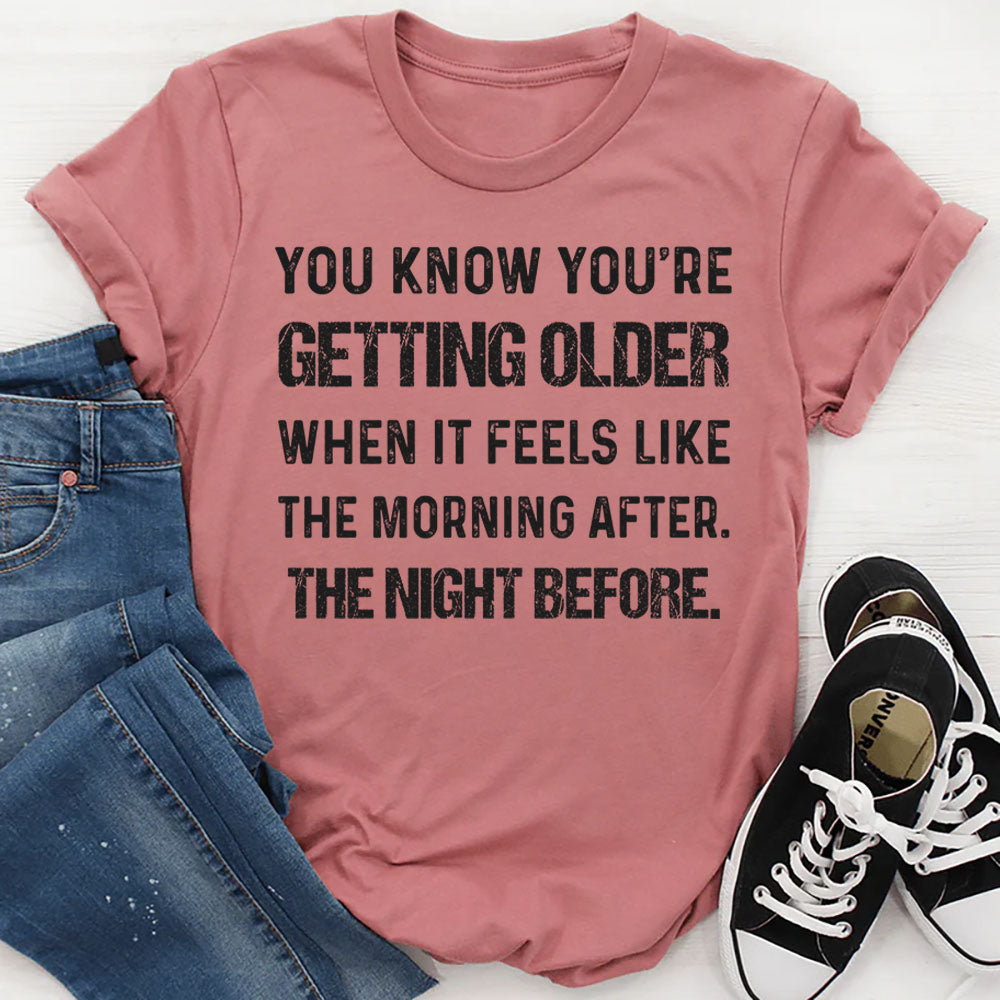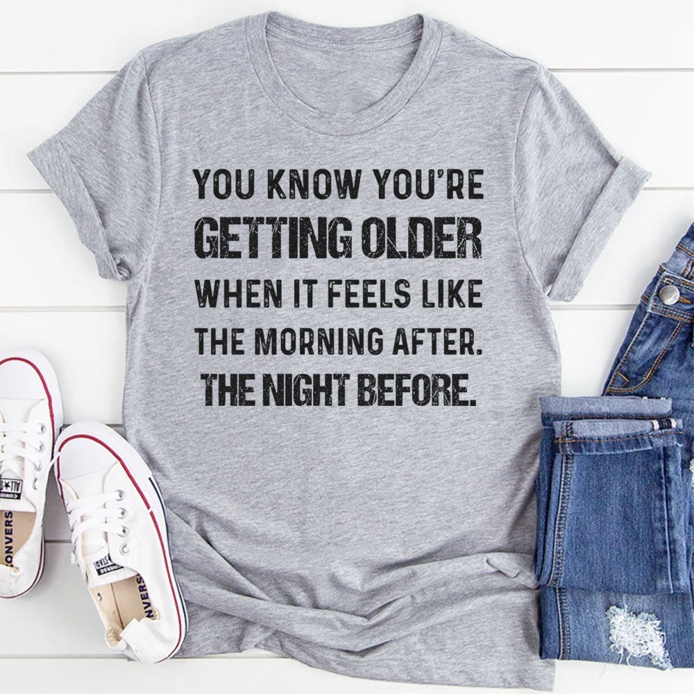 Embrace the humor of aging with the “You Know You’re Getting Older When It Feels Like the Morning Before the Night” t-shirt. Perfectly witty and a little too real, this tee is great for anyone who’s felt the struggle of nights getting shorter and mornings hitting harder. Guaranteed to get laughs (and knowing nods) from friends and family.